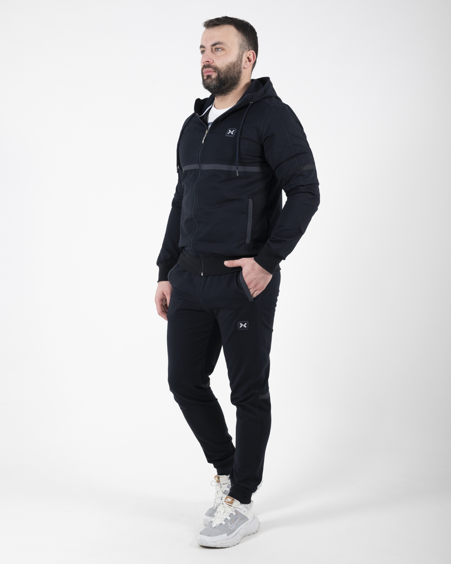 Muški komplet trenerke modernog urbanog dizajna, namenjen muškarcima koji žele spoj sportskog komfora i elegantnog izgleda. Idealan za svakodnevne aktivnosti, šetnje, putovanja i opuštene varijante nošenja.