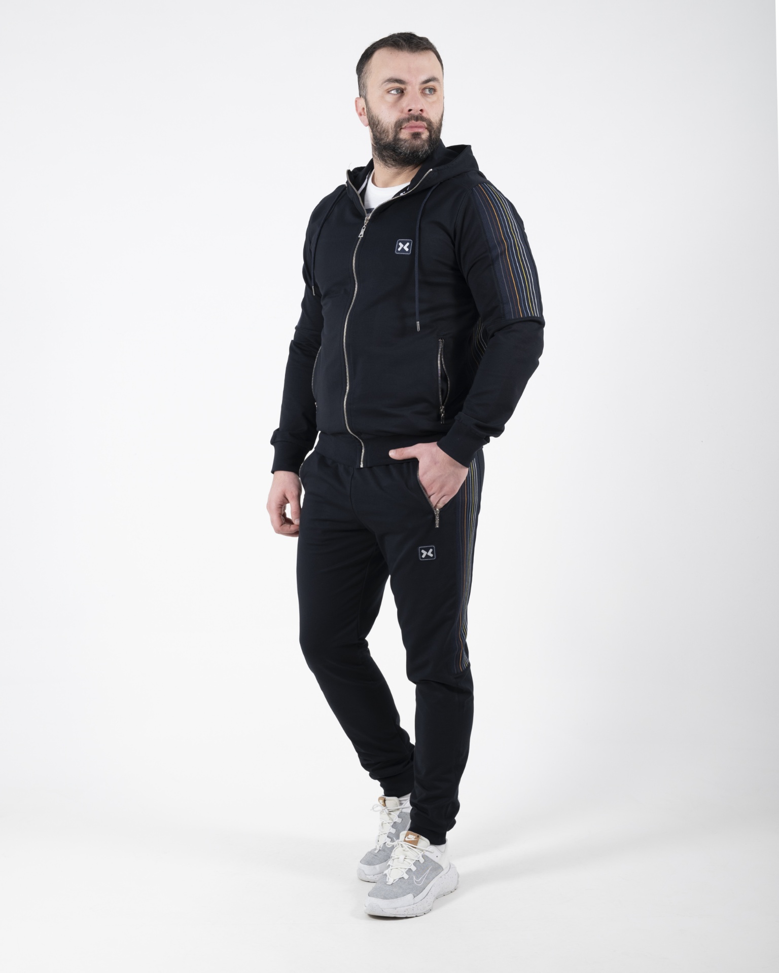 Blago uži (slim fit) kroj prati liniju tela bez osećaja stezanja, dok lagan i elastičan materijal omogućava slobodu pokreta tokom celog dana. Diskretne vertikalne pruge sa strane daju kompletu moderan i dinamičan izgled. Gornji deo ima kapuljaču i praktične džepove sa rajfešlusom, dok donji deo pruža sigurnost i funkcionalnost zahvaljujući više džepova.