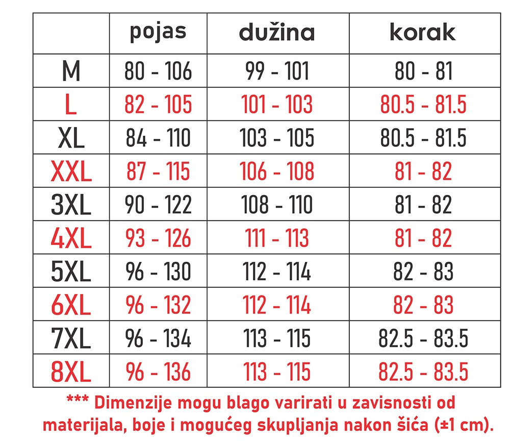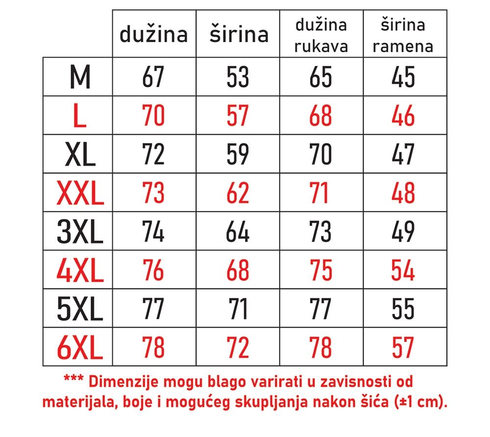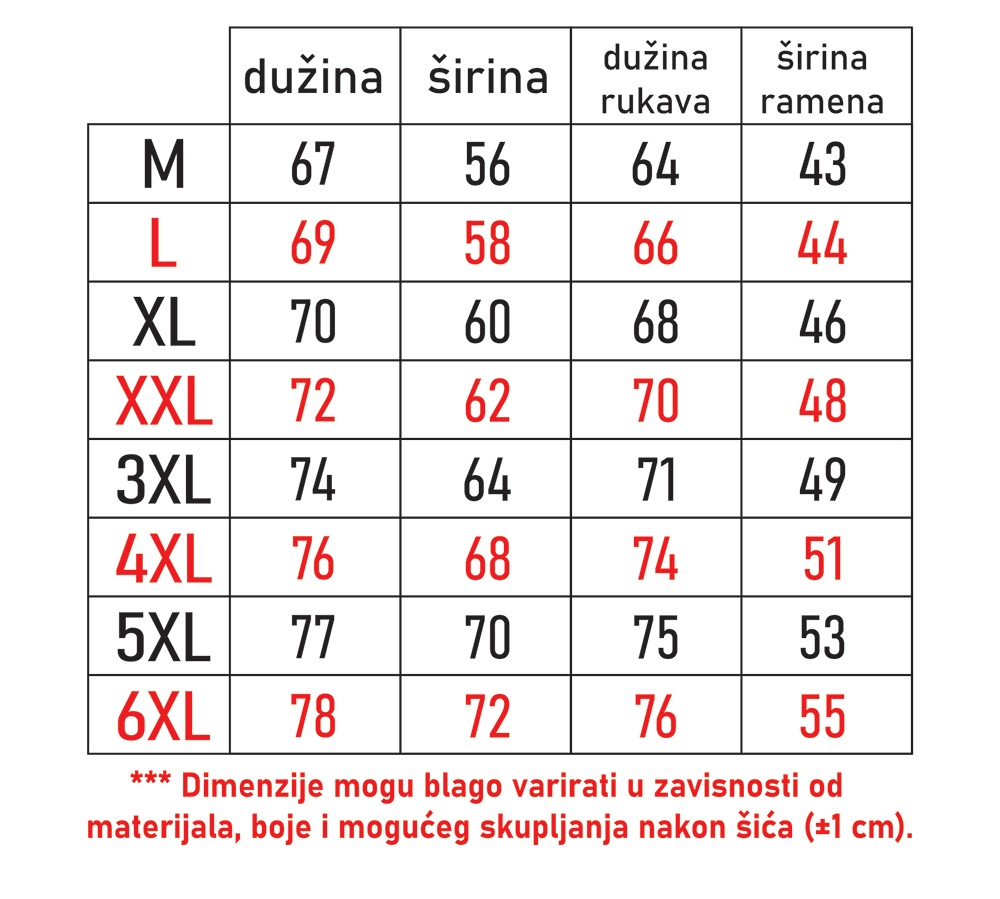 Dimenzije mogu blago varirati (±1 cm) u zavisnosti od materijala, boje i skupljanja nakon šivenja.